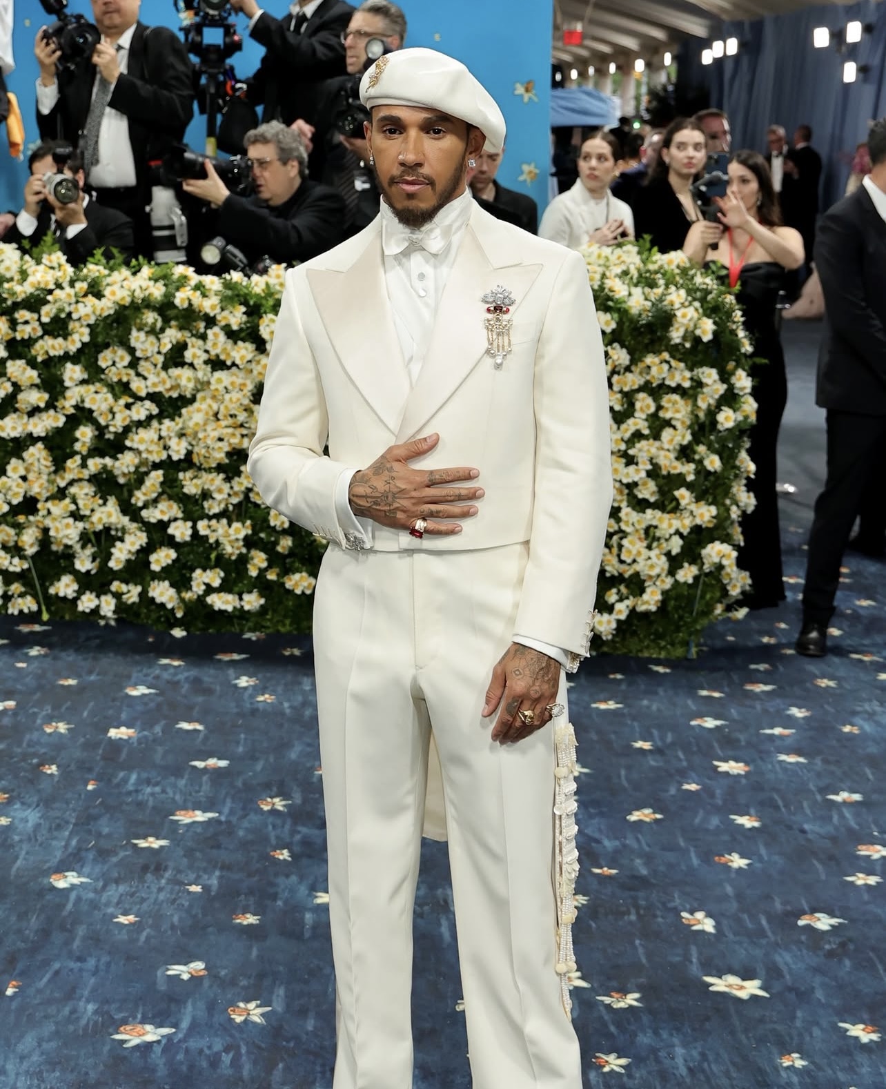 Lewis Hamilton ghi điểm với diện mạo bảnh bao và lịch lãm trong bộ suit trắng.