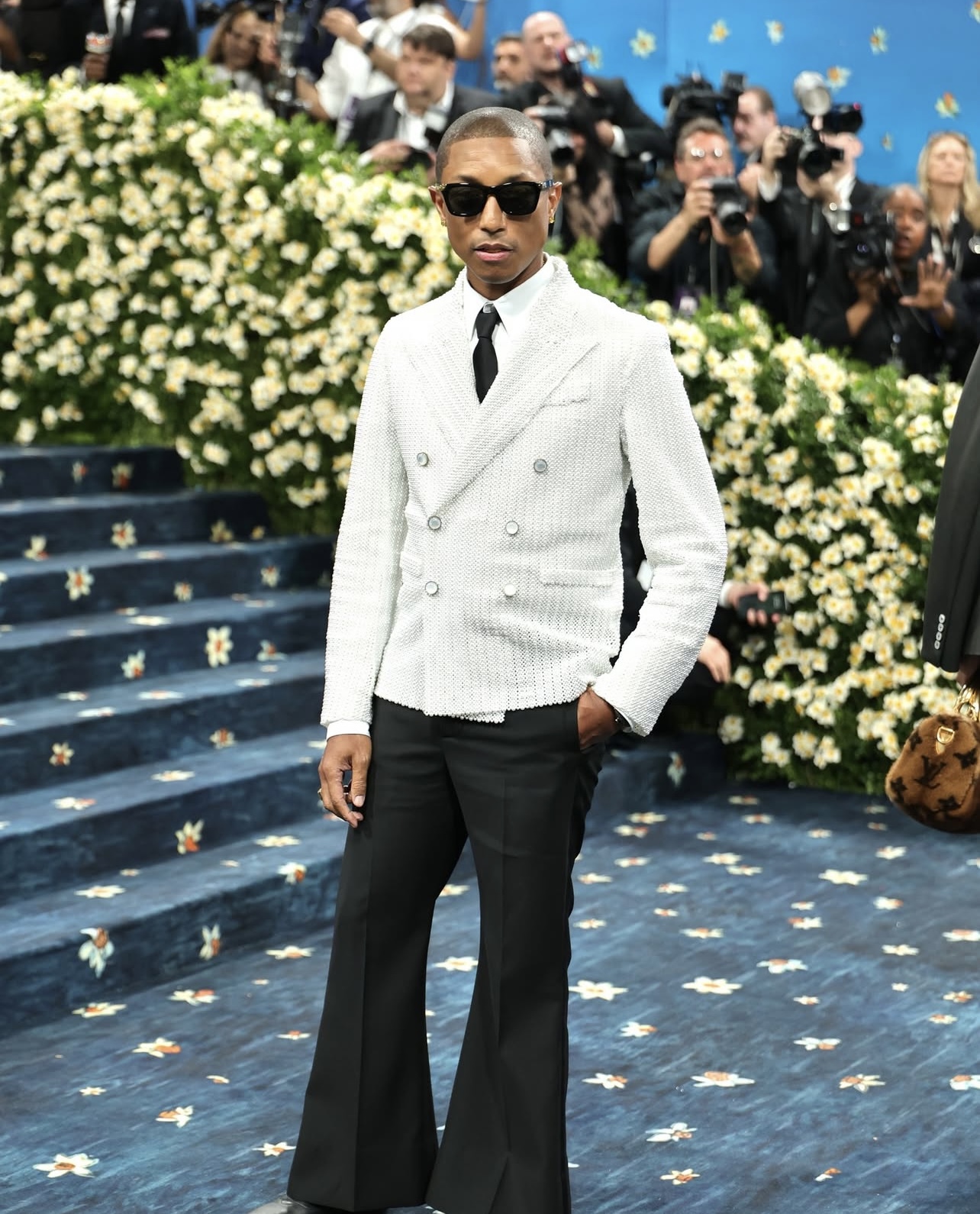 Pharrell Williams lựa chọn blazer tweed cùng quần ống loe tông màu đen – trắng từ Louis Vuitton để hoàn thiện outfit tại Met Gala 2025.