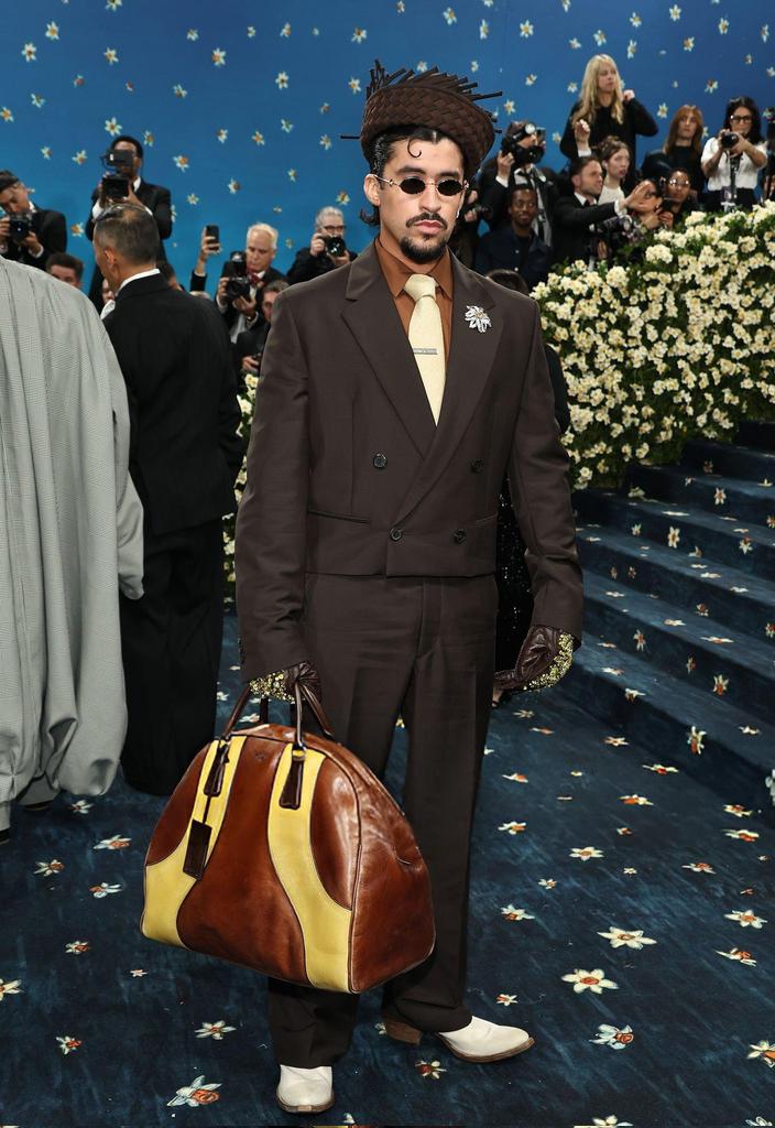 Bad Bunny gây ấn tượng với bộ suit tông màu trung tính cổ điển cùng chiếc mũ được lấy cảm hứng từ “Pava” – trang phục truyền thống của người Puerto Rico.