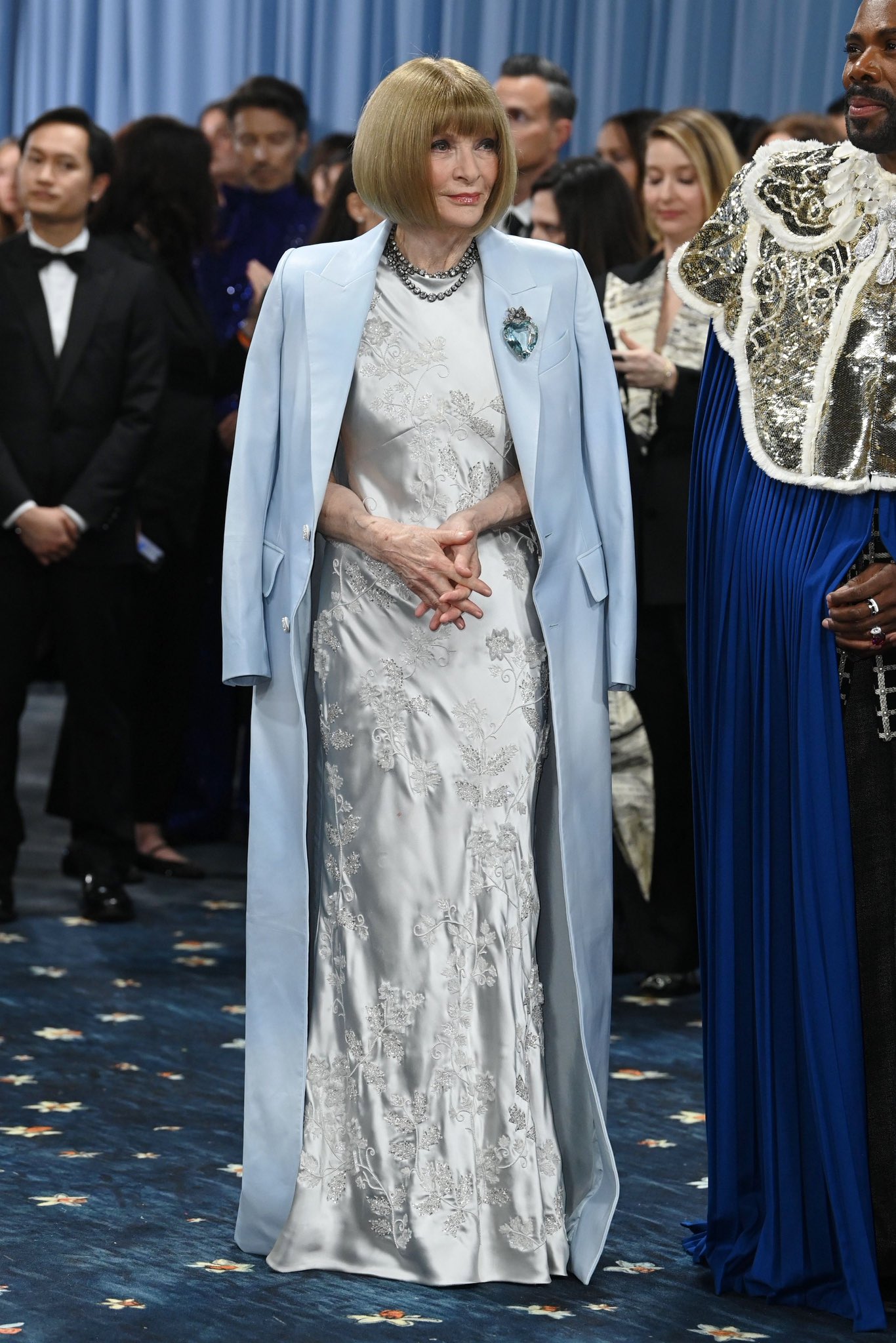 “Chủ xị” Anna Wintour quyền lực, sang trọng trong mẫu váy lụa thêu đính hoạ tiết, phối cùng áo khoác dáng dài.