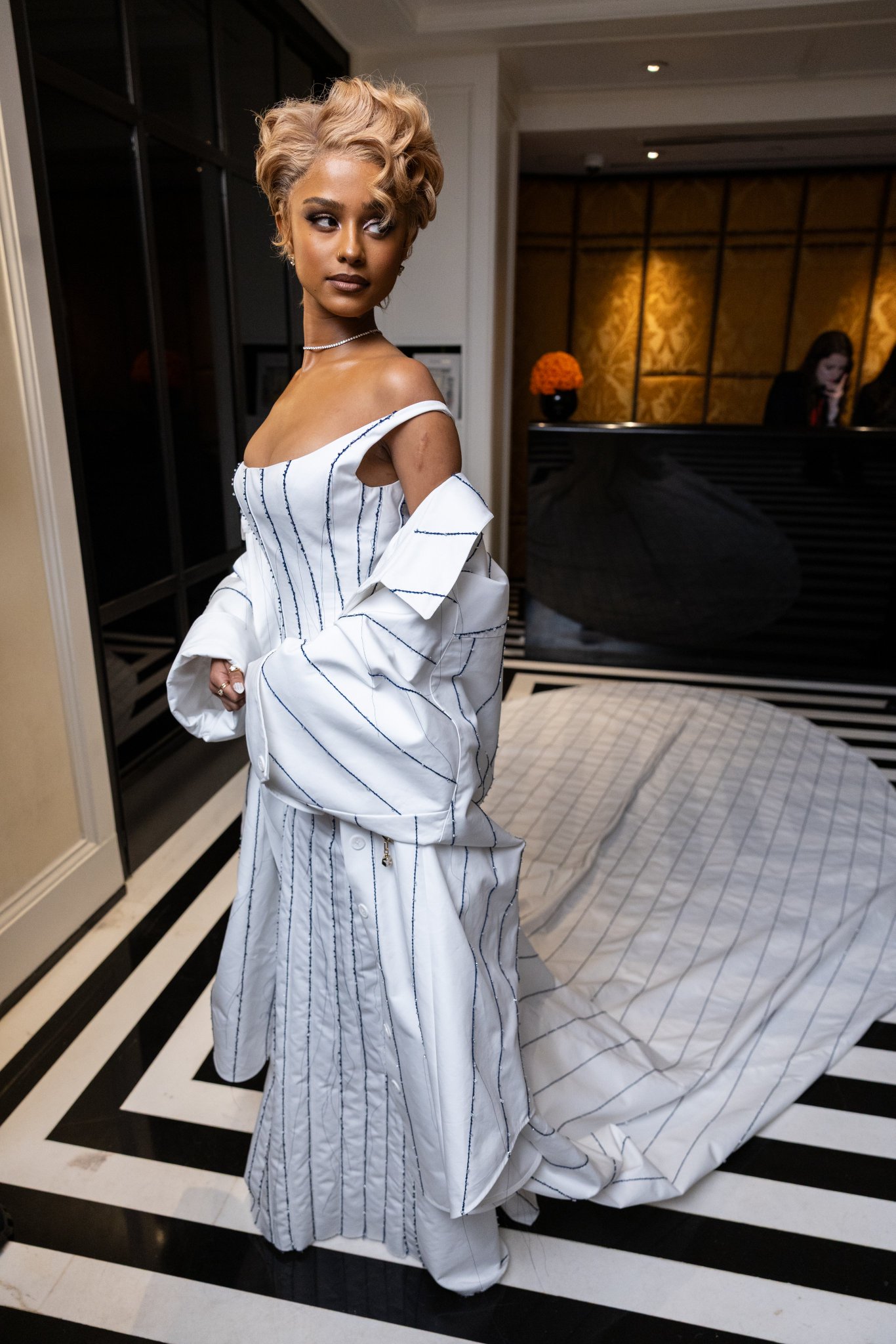 Tyla cực slay trong mẫu váy được custom riêng từ Jacquemus, lấy cảm hứng từ André Leon Talley, khoe khéo vòng 1 căng đầy quyến rũ. Điểm sáng trong tạo hình này chính là kiểu tóc ngắn được uốn xoăn ngẫu hứng nhưng không kém phần quý phái, sang trọng.