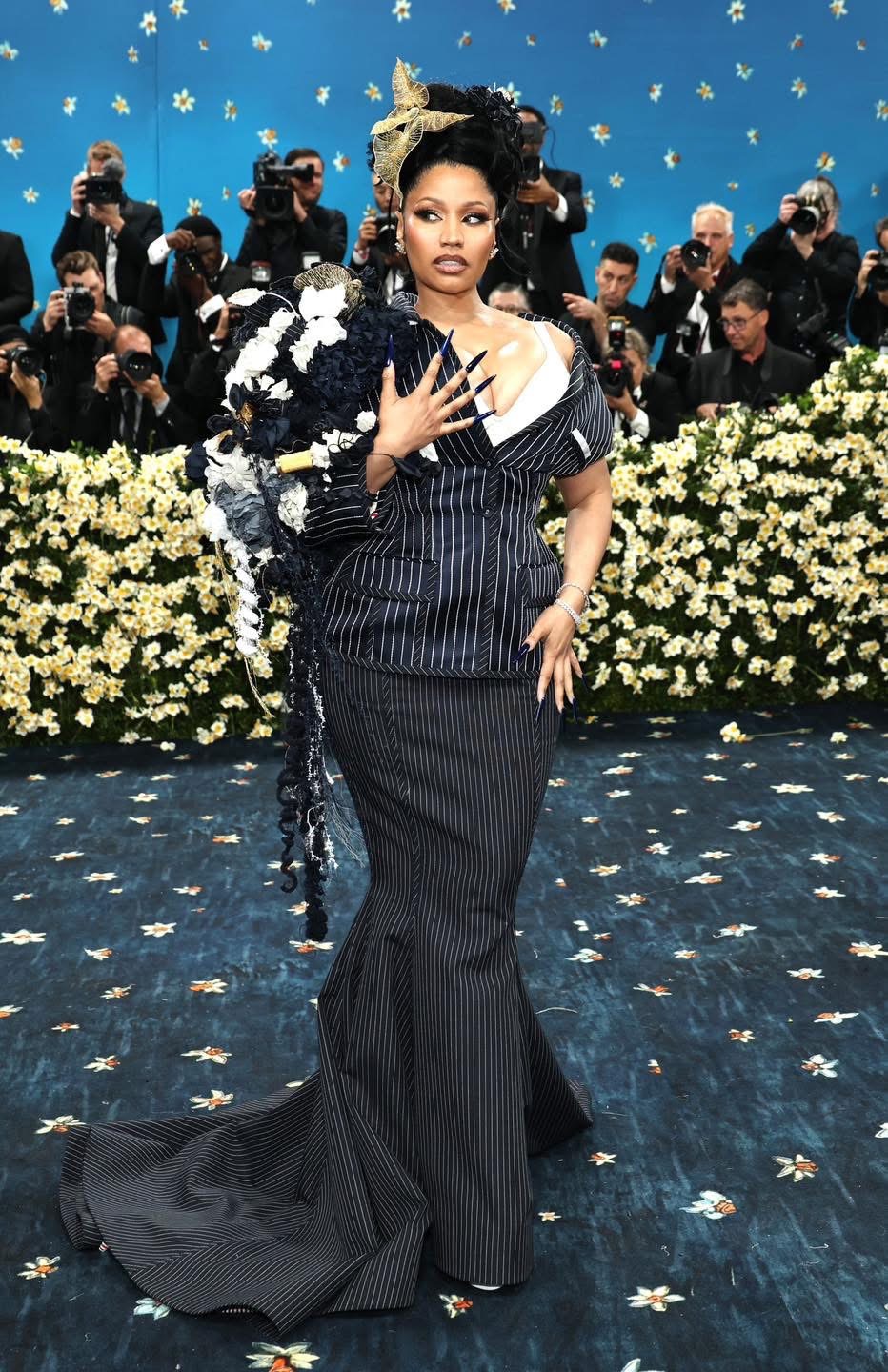 Nicki Minaj xuất hiện cùng bộ trang phục hoạ tiết kẻ của Thom Browne, với điểm nhấn hoa cài ở vai độc lạ.