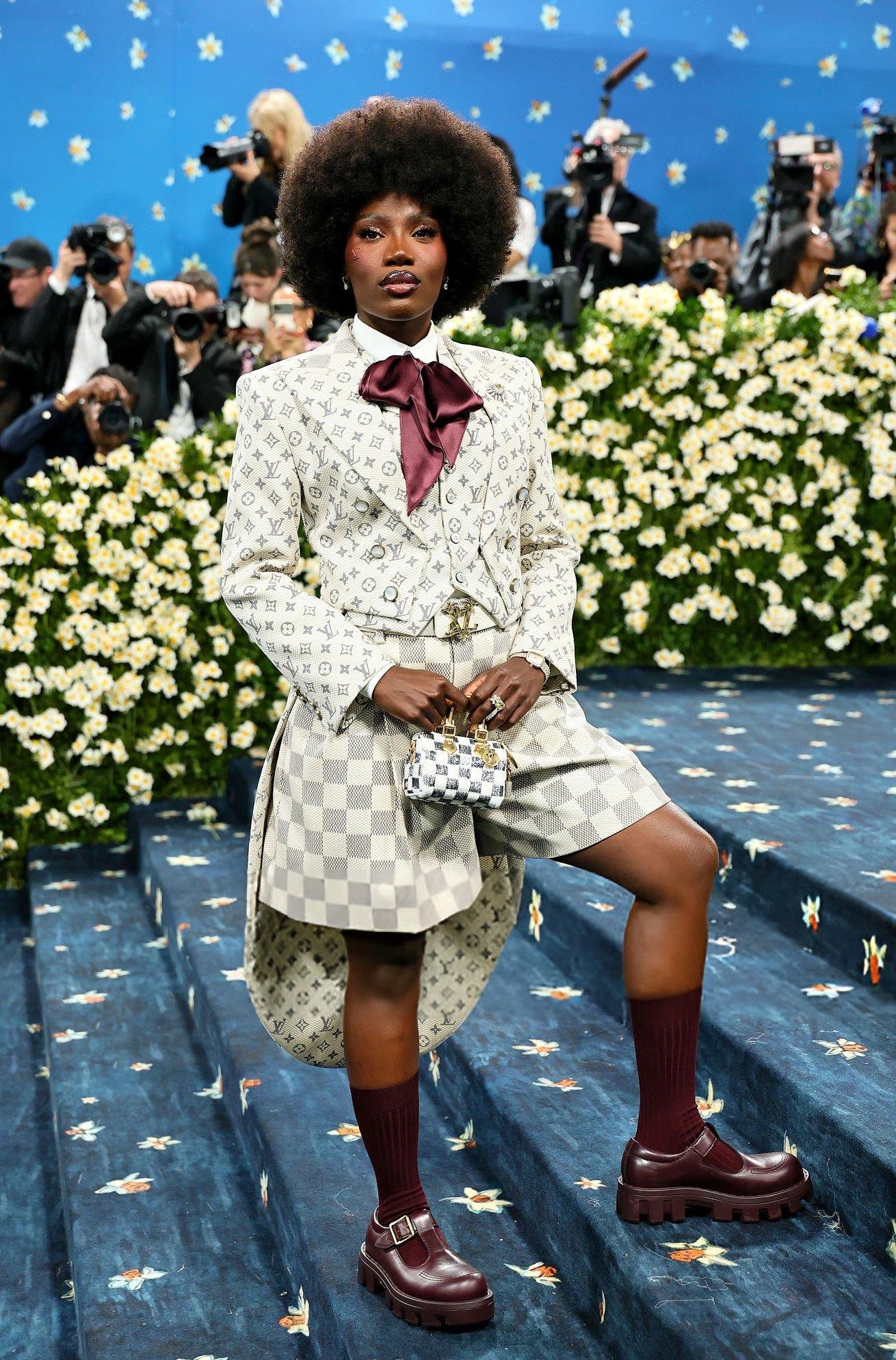 Doechii ghi điểm hoàn toàn với trang phục vừa đúng chủ đề lại đẹp, ấn tượng. Chủ nhân Grammy diện bộ suit in logomania biểu tượng của Louis Vuitton, gồm blazer độn vai, sơ mi nơ cài cùng quần short bermuda. Việc phối cùng tất cổ cao và giày loafers giúp tạo hình nữ rapper thêm phần phong cách.