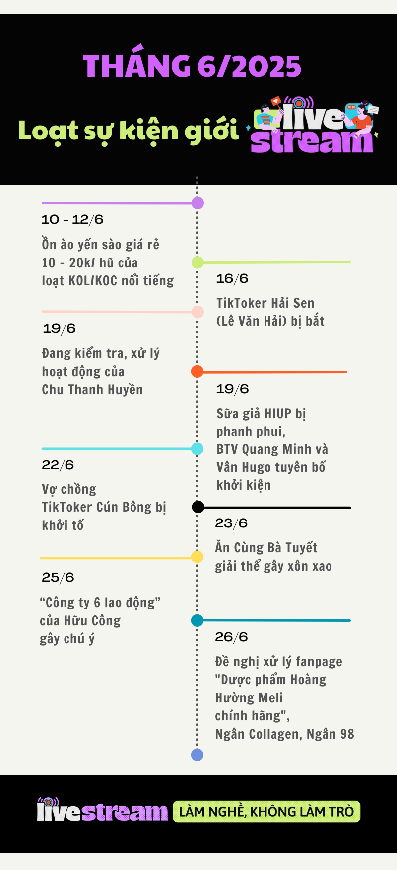 Để mô tả ngắn gọn bức tranh giới livestream trong tháng 6/2025, có lẽ không gì chính xác hơn từ: Nóng như chảo lửa. Hàng loạt cái tên quen thuộc với công chúng, có hàng triệu người theo dõi lần lần lượt bị gọi tên trong các vụ lùm xùm về chất lượng sản phẩm, kiểm tra, thậm chí là khởi tố và bắt giữ.