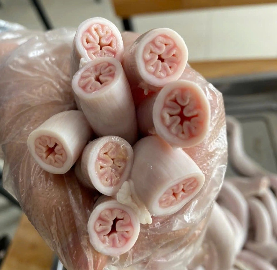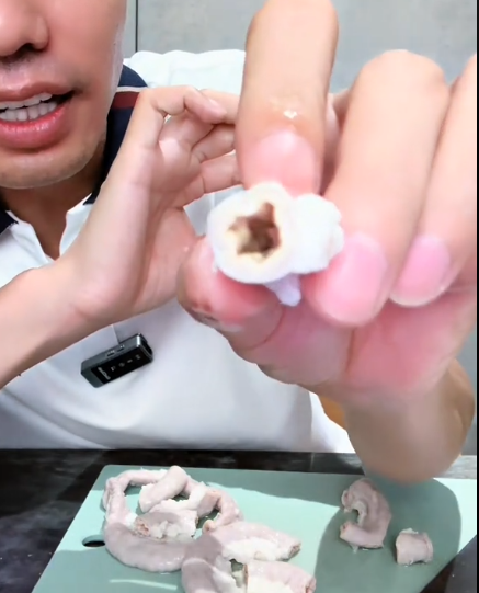 Theo đó, người này mua lòng non tươi về, sau đó ngâm trong nước pha phèn chua suốt 3 tiếng. Kết quả khiến nhiều người bất ngờ: Miếng lòng trở nên dày, giòn, nổi vân xoắn, gần giống với đặc điểm của lòng se điếu thật.