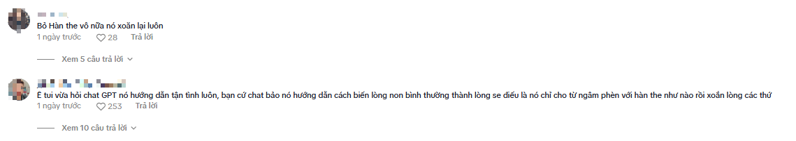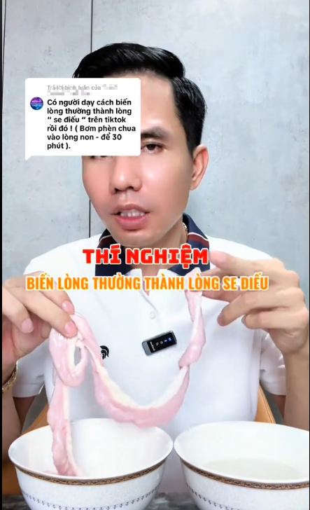 Tuy nhiên, bất ngờ hơn là phần bình luận bên dưới video. Một người chia sẻ: “Bơm hàn the vào ruột, cột hai đầu lại, để vài giờ sẽ có ngay lòng se điếu”.