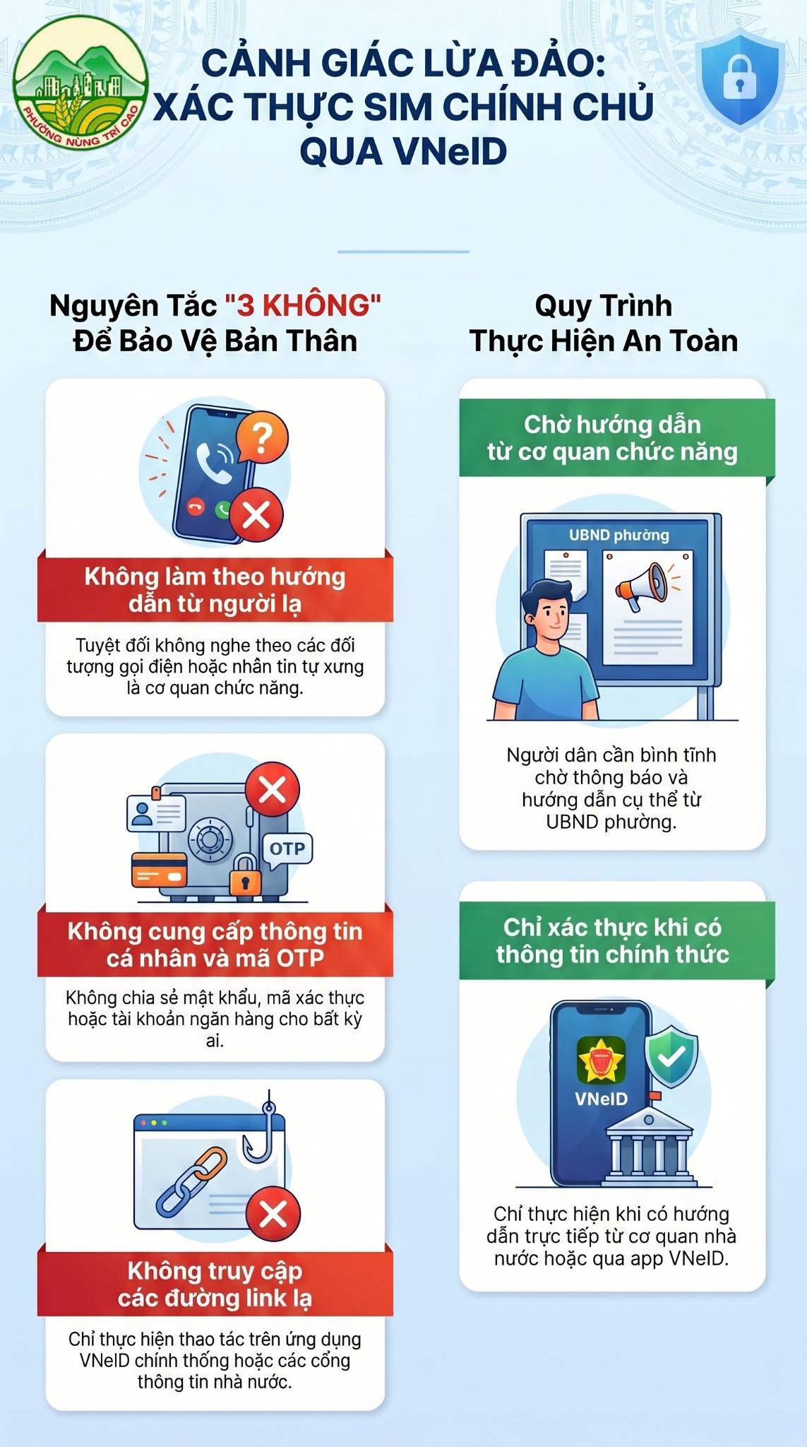Trước tình trạng trên, Công an tỉnh Bắc Ninh khuyến cáo người dân tuyệt đối không cung cấp thông tin cá nhân, mã OTP cho bất kỳ ai qua điện thoại. Đồng thời, không truy cập các đường link lạ, chỉ sử dụng ứng dụng chính thức của nhà mạng để thực hiện chuẩn hóa thông tin thuê bao hoặc xác thực sinh trắc học.