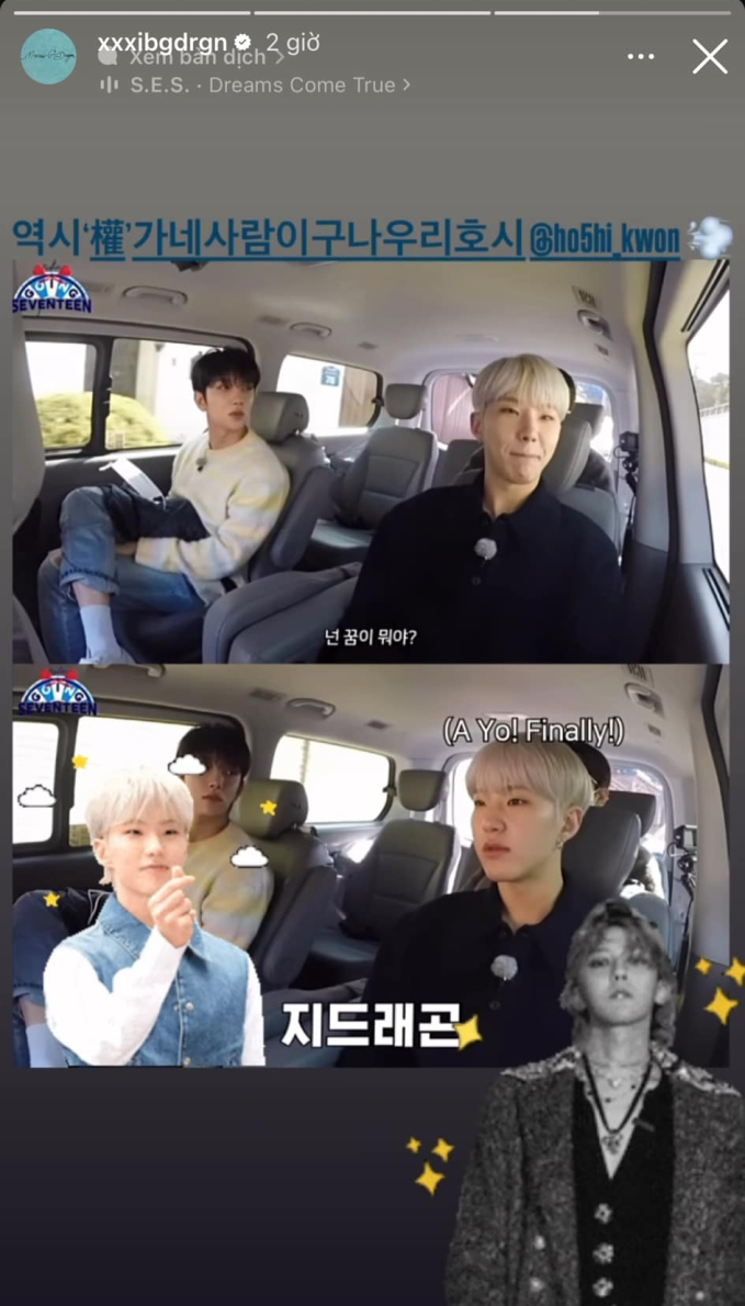 Nhiều fan cũng cho rằng, có khả năng có một màn collab giữa G-Dragon và Hoshi. Thời gian qua, Hoshi có nhiều tương tác đặc biệt với thủ lĩnh BIGBANG. Hoshi liên tục bày sự ngưỡng mộ với G-Dragon, “anh Long” cổ vũ người em cùng họ (pv: Hoshi tên thật là Kwon Soonyoung, cùng họ với G-Dragon, tên thật Kwon Jiyong). Cả hai còn có bạn chung là tài tử Lee Soo Hyuk. Hồi tháng 9, Hoshi cùng nhóm nhỏ BSS biểu diễn tại concert Taeyang, tại đây đã gặp gỡ, chào hỏi G-Dragon. Mối quan hệ giữa cỗ máy nhảy của SEVENTEEN với G-Dragon khiến dân tình phấn khích.