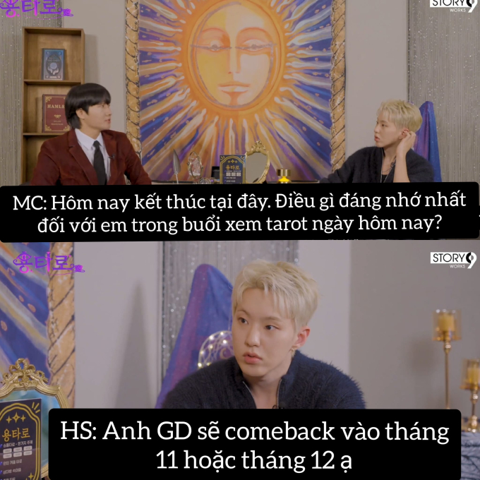 Một khoảnh khắc đang cực viral trên các diễn đàn Kpop, chia sẻ về thành viên Hoshi của nhóm nam triệu bản SEVENTEEN tham gia chương trình xem bài tarot. Trên sóng show thực tế, Hoshi dành riêng một câu hỏi cho màn comeback của tiền bối G-Dragon. Đến cả thần tượng nổi tiếng như Hoshi cũng “hóng” G-Dragon ra nhạc.