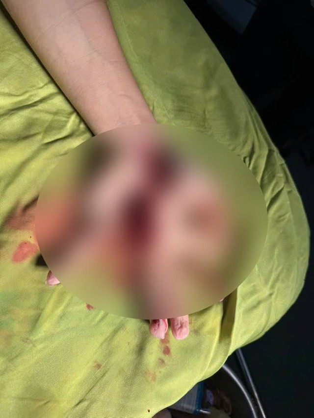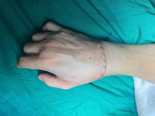 – Bàn tay phải gần như cụt hoàn toàn tại cổ tay, chỉ còn dính 1,5cm da. Tay bị mất hoàn toàn cấp máu. Vùng da còn lại đã được cắt bỏ do gây khó khăn cho việc tìm mạch.