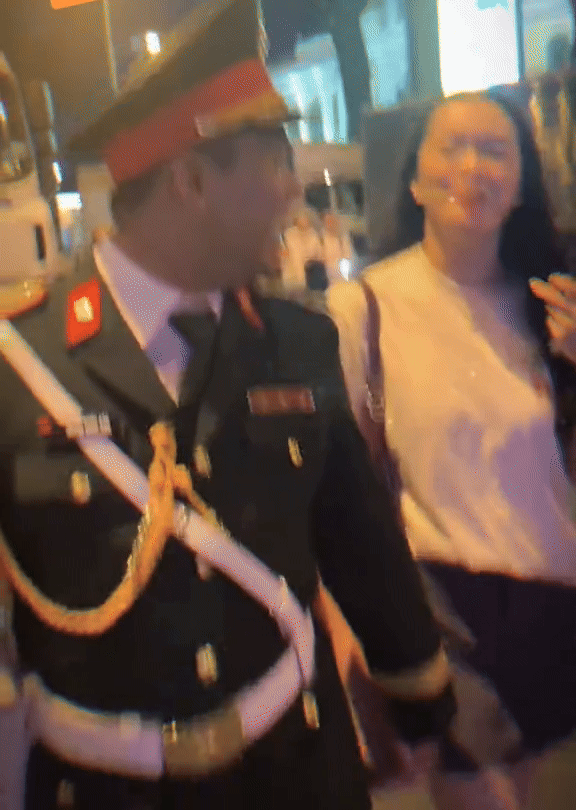 Nam chiến sĩ làm nhiệm vụ diễu binh ở Xe chỉ huy cùng với vợ sánh đôi sau khi hoàn thành tổng hợp luyện. (Nguồn: @hala_036)