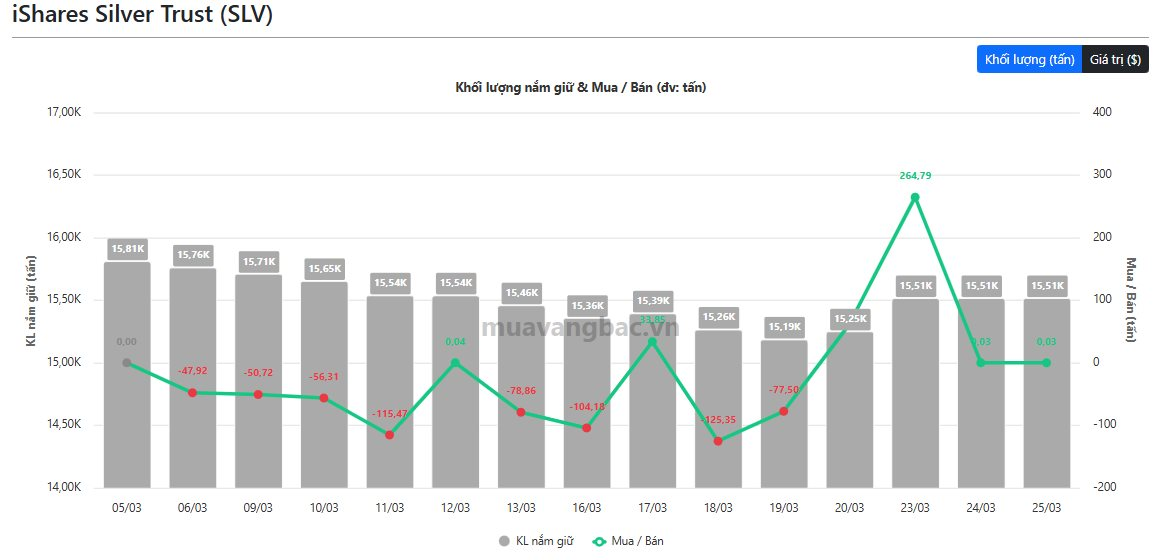Trong khi đó, quỹ bạc lớn nhất thế giới iShare Silver Trust (SLV) tiếp tục thăm dò với lượng bạc mua thêm trong ngày 25/3 duy trì mức thấp, gần như không đáng kể. Đây là ngày thứ 4 liên tiếp SLV mua ròng. Trước đó, quỹ đã mua vào hơn 300 tấn bạc chỉ trong 2 ngày 20-23/3. Động thái đẩy tổng lượng bạc do SLV nắm giữ lên trên 15.510 tấn.