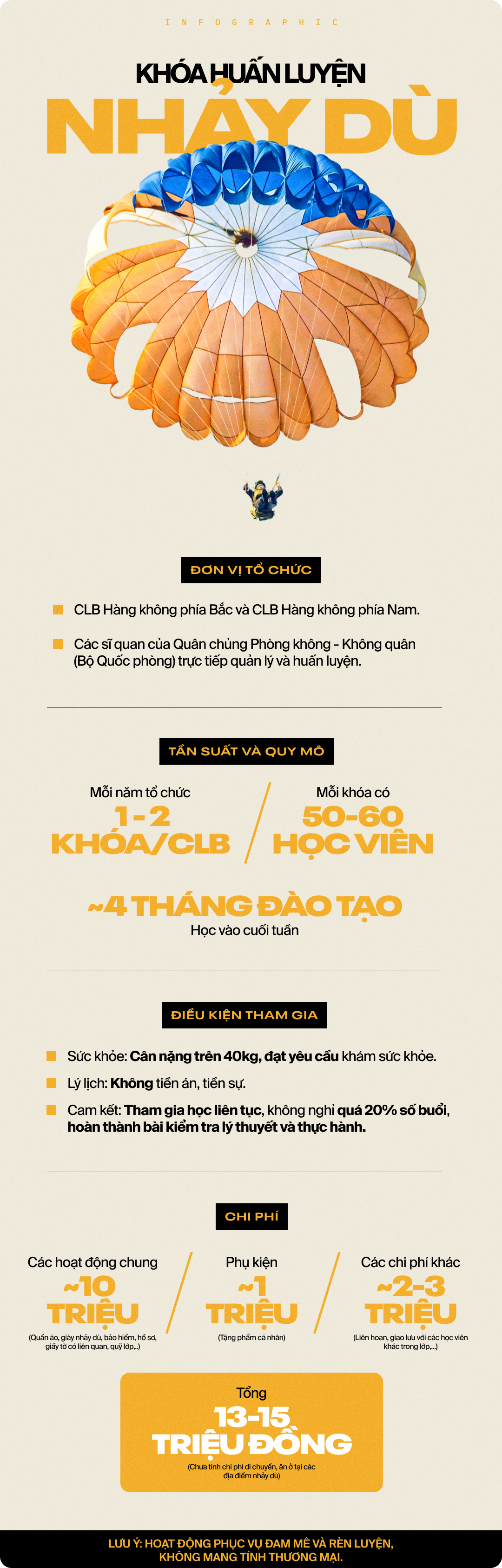 “Các khoản chi để phục vụ cho những nhu cầu thiết yếu trong quá trình huấn luyện, tổ chức hoạt động chung của lớp, triển khai nhảy dù, gắn kết các thành viên, mua sắm thêm phụ kiện, quần áo, tặng phẩm như: (1) Các hoạt động chung của lớp huấn luyện (Quần áo, giày nhảy dù, bảo hiểm, làm hồ sơ, giấy tờ, thủ tục có liên quan, quỹ lớp,…) khoảng 10 triệu; (2) Phụ kiện, tặng phẩm cá nhân: khoảng 1 triệu; (3) Chi phí khác (Liên hoan, giao lưu với các học viên khác trong lớp): 2 – 3 triệu”.