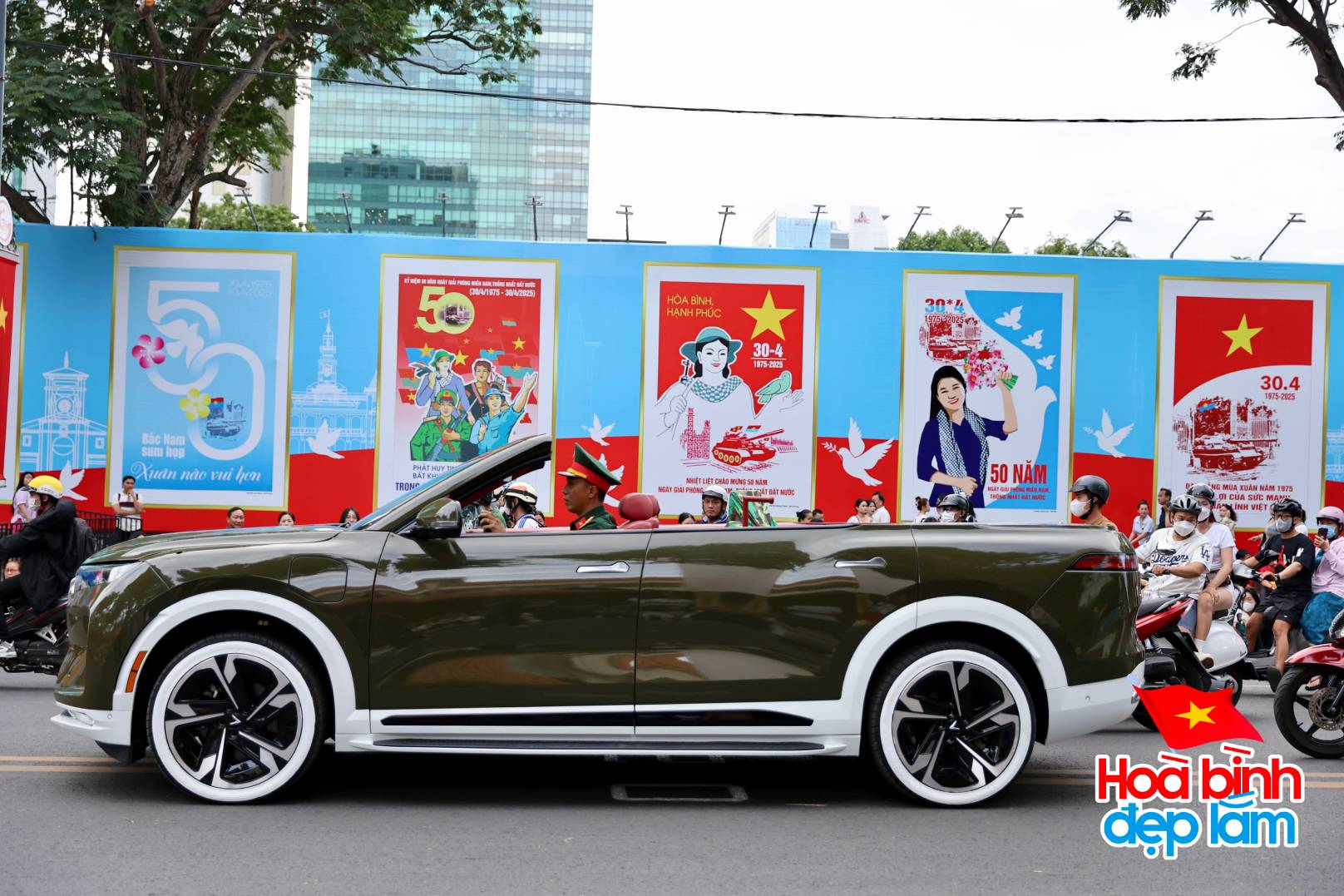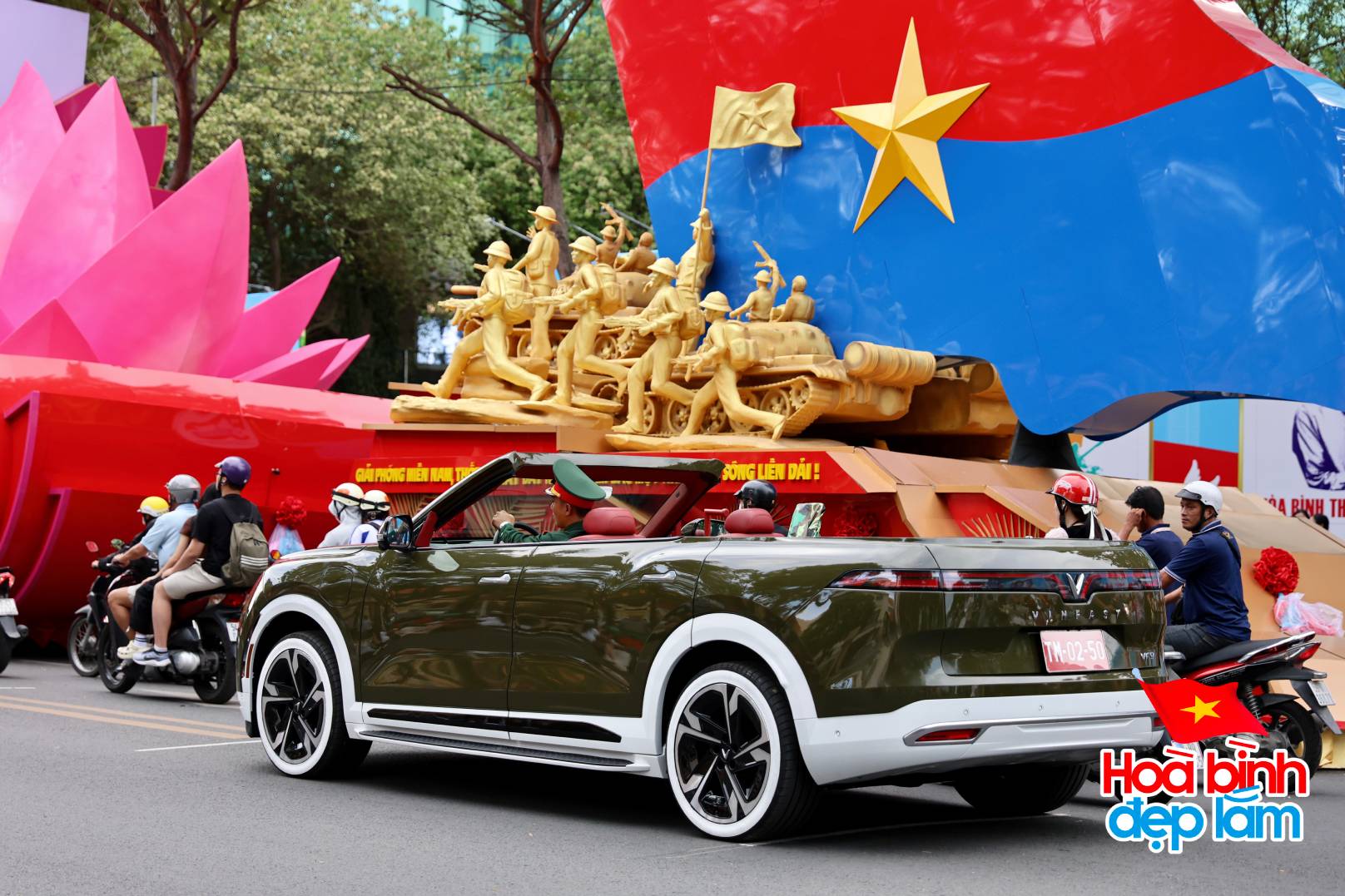 Dàn xe VF9 mui trần di chuyển trên đường Lê Duẩn đã tiến vào khán đài cho công tác chuẩn bị cho buổi tổng hợp luyện tối nay.