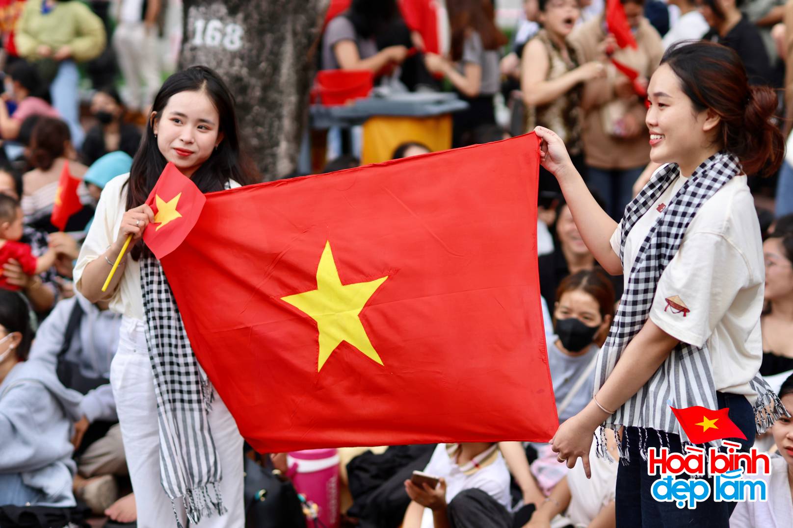 Các bạn trẻ mang theo cờ tổ quốc xếp hàng từ sớm tại đường (Ảnh: Viết Thanh)