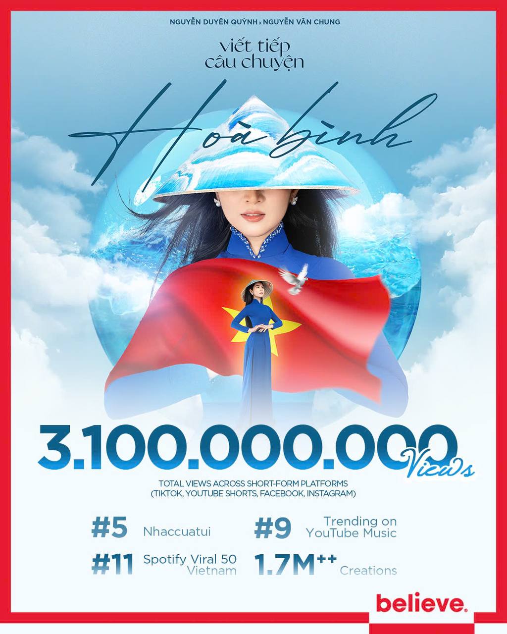Với giai điệu nhẹ nhàng cùng lời ca tràn đầy lòng yêu nước, Viết Tiếp Câu Chuyện Hòa Bình hiện đã vượt mốc 3,1 tỷ lượt xem trên các nền tảng Facebook, TikTok, YouTube, #9 Trending YouTube Music, #18 Viral 50 Vietnam trên Spotify và hơn 1,7 triệu video sáng tạo trên nền nhạc ca khúc.