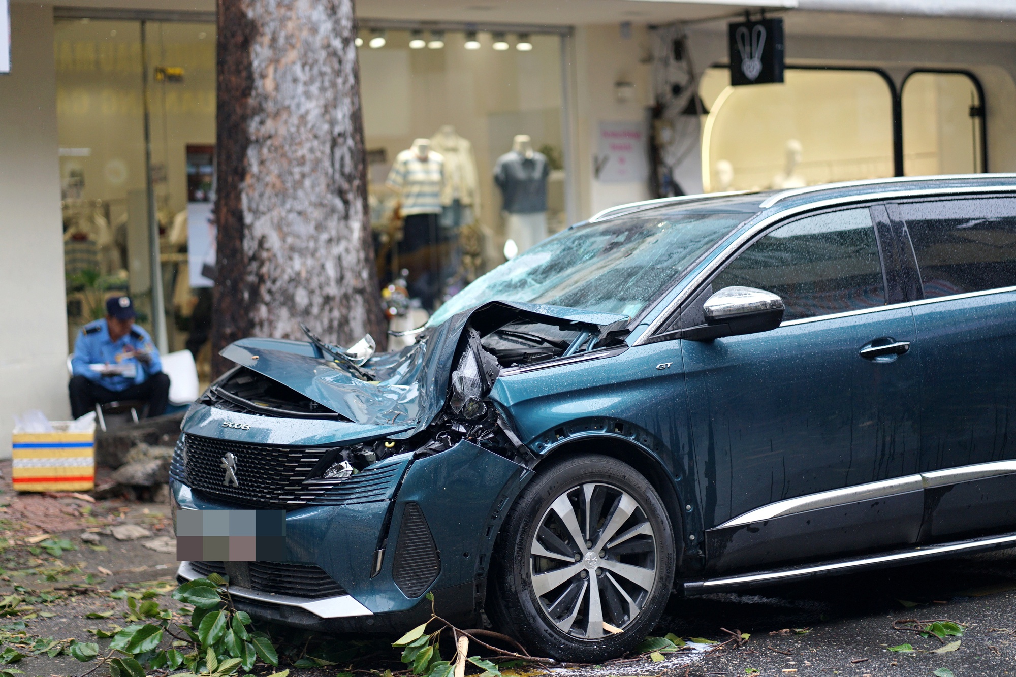 Chiếc ô tô đang đỗ bên đường đã bị cây ngã đè trúng ở phường An Khánh. Ảnh: Viết Thanh
