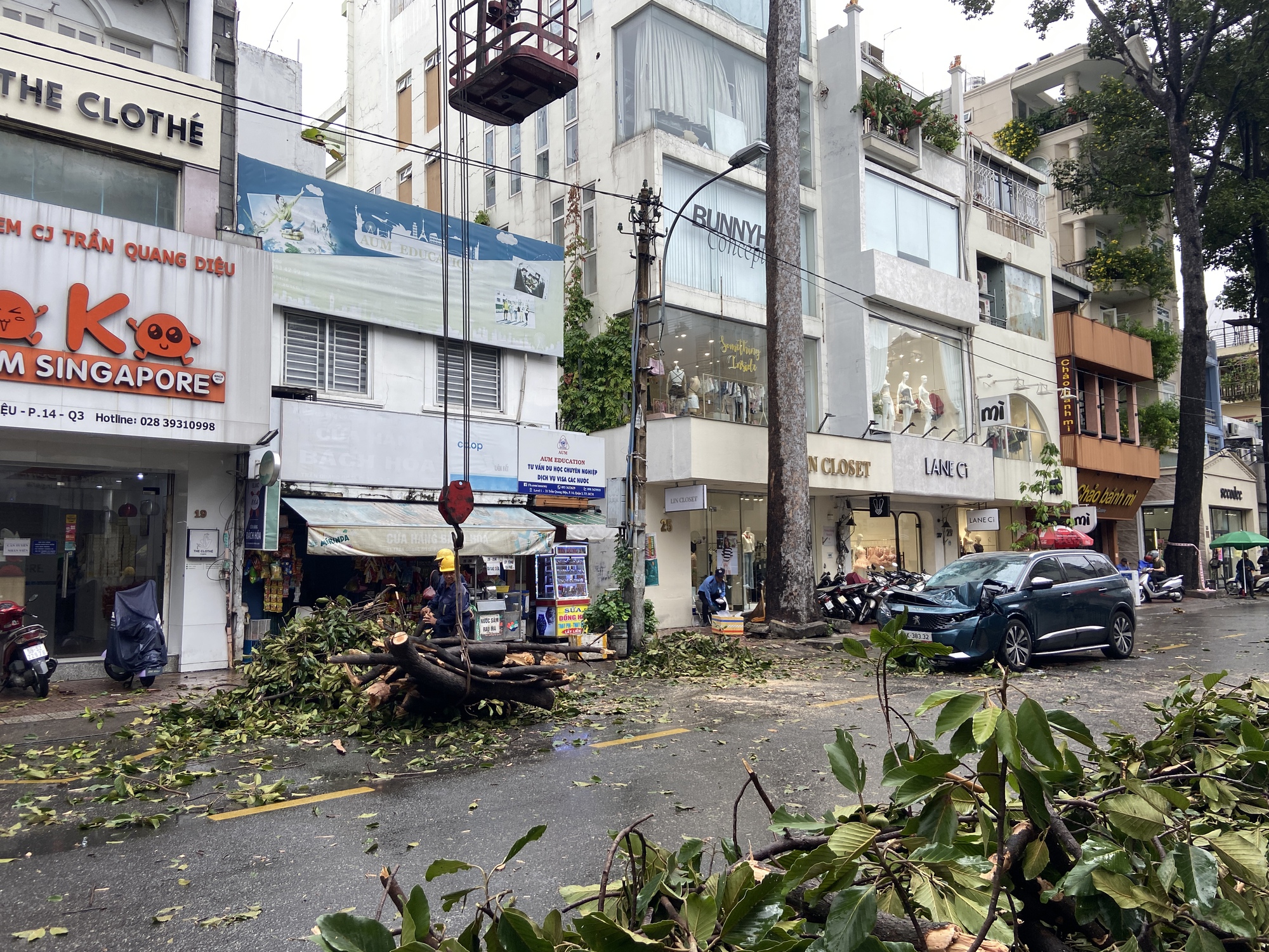 Bà Phan Thị Lan (phường Nhiêu Lộc, TP.HCM) chia sẻ: “Gió nó thổi ào xuống, bất thình lình quá chị trở tay không kịp, chị đứng bên này mà ào cái nguyên cả cái nhánh cây bên kia nó đổ xuống, chị trở tay không kịp. Tất cả trong khoảng 10 phút. Gió trên cao nó xào xạc mà ầm cái cây nó đổ xuống. Xe này nó chồm tới cái thì nhánh cây nó đổ xuống liền”.