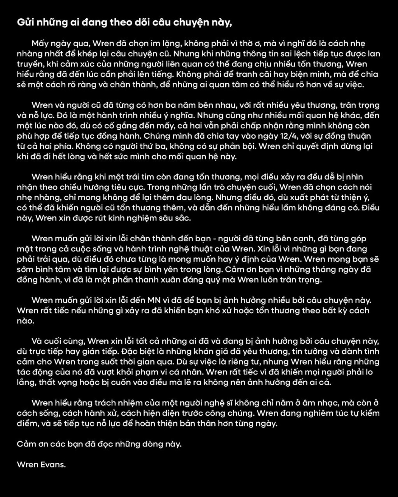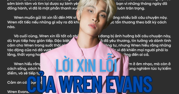 Sau chuỗi ngày ngập chìm trong drama, cuối cùng Wren Evans cũng đã lên tiếng với một bức tâm thư. Lời xin lỗi đầu tiên từ phía anh kể từ khi mọi chuyện vỡ ra: nghi vấn phản bội, lừa dối sau lưng, những lần nói dối nối tiếp và một mối quan hệ tan vỡ trong im lặng của người ra đi và nước mắt của người ở lại.