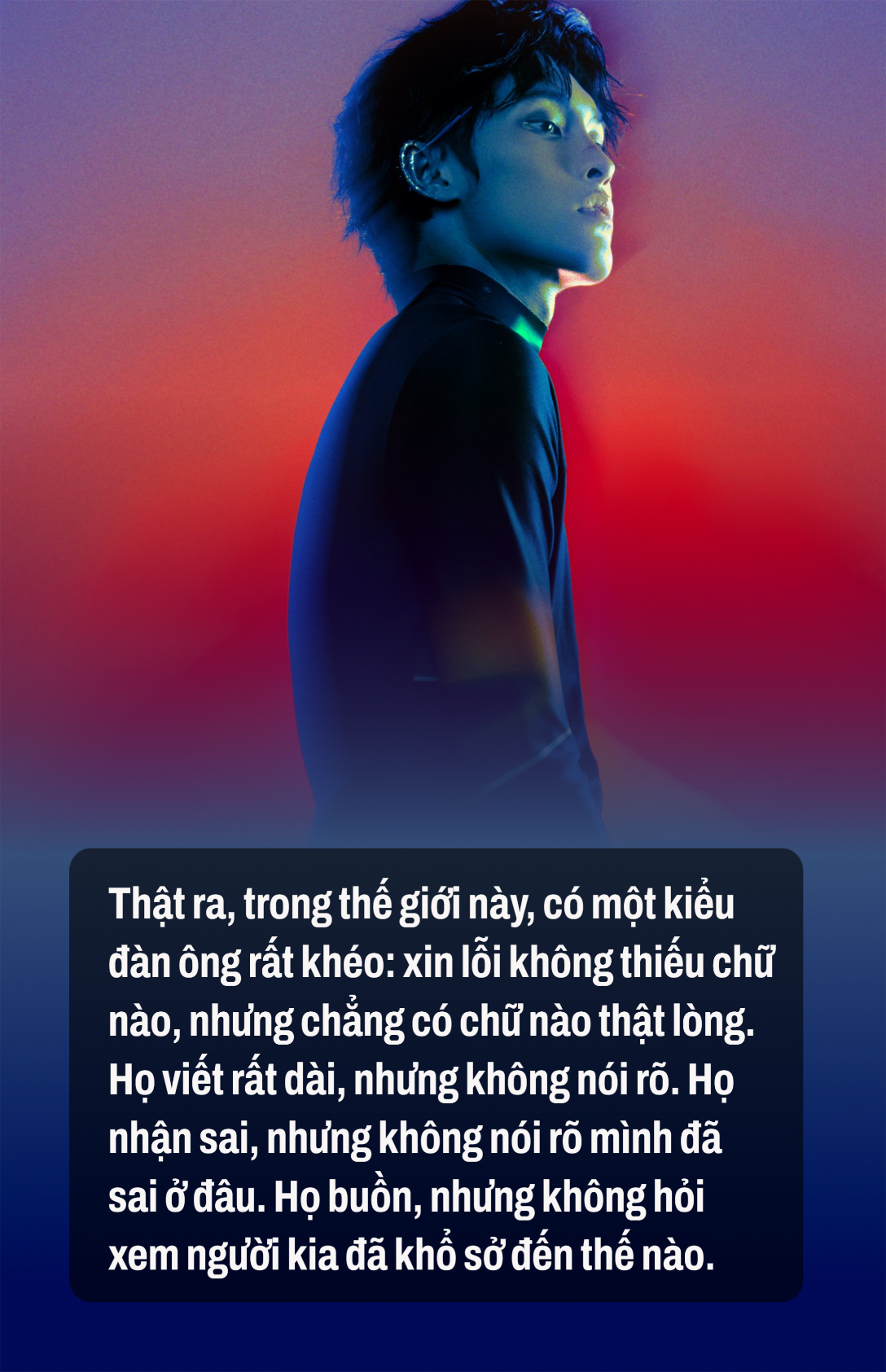 Thật ra, trong thế giới này, có một kiểu đàn ông rất khéo: xin lỗi không thiếu chữ nào, nhưng chẳng có chữ nào thật lòng. Họ viết rất dài, nhưng không nói rõ. Họ nhận sai, nhưng không nói rõ mình đã sai ở đâu. Họ buồn, nhưng không hỏi xem người kia đã khổ sở đến thế nào.