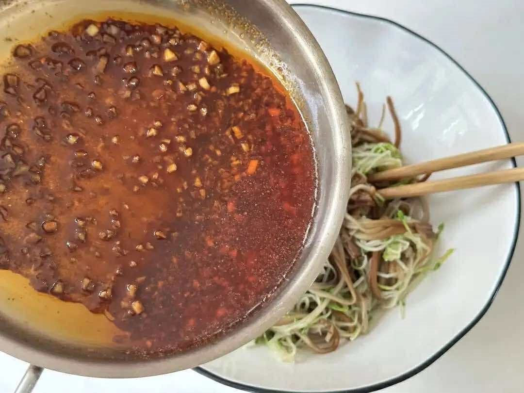 Bước 2: Sau đó bạn đặt một nồi nước lên bếp, đun sôi rồi cho rau mầm vào chần qua. Nấm kim châm bạn cho vào nồi nước sôi luộc chín. Sau khi chần xong các nguyên liệu bạn vớt ra, để ráo nước. Đun nóng dầu trong một chiếc chảo nhỏ, cho tỏi băm vào xào đến khi dậy mùi thơm. Tiếp theo bạn cho bột ớt, một ít hạt mè trắng, nước tương, giấm, dầu hào, gia vị, đường rồi xào đều. Đây là loại nước sốt có màu đỏ cực thơm ngon, tạo màu đẹp cho món ăn mà không cay.