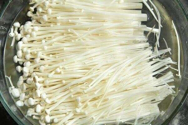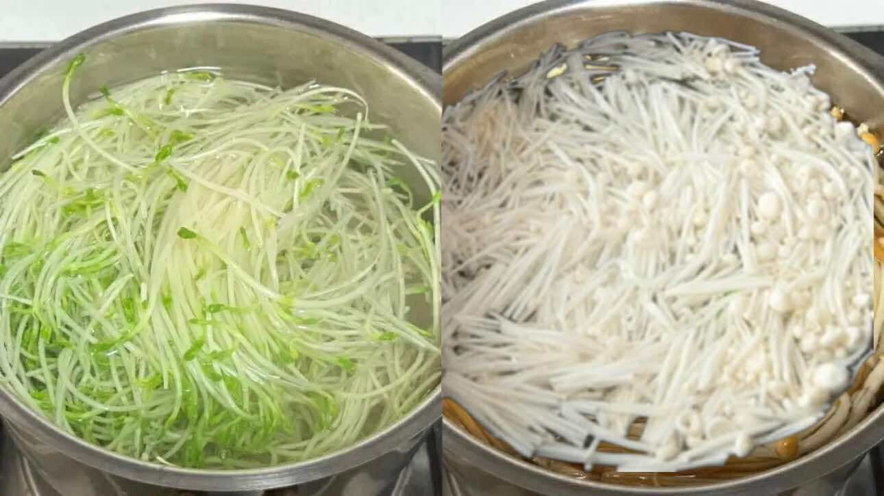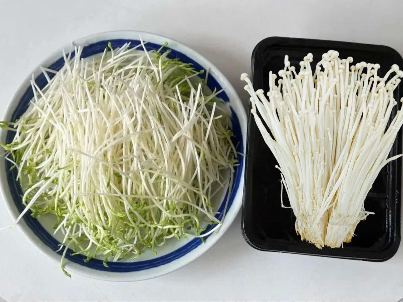 Bước 1: Lấy nấm kim châm và rau mầm đậu xanh ra khỏi hộp. Sau đó cắt bỏ gốc nấm kim châm, tách rời chúng ra rồi đem rửa sạch. Rau mầm đỗ xanh bạn nhặt bỏ rễ rồi rửa sạch, nhẹ tay để tránh bị dập nát.