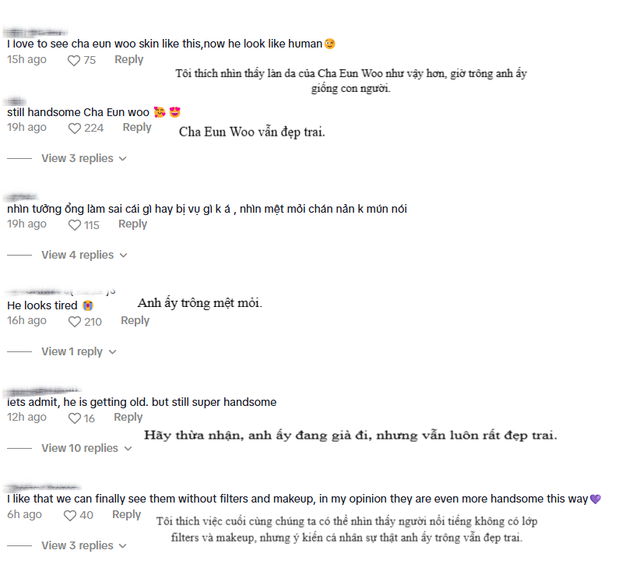 Cha Eun Woo lộ rõ dấu hiệu mệt mỏi, kém rạng rỡ trước ống kính máy quay. Dù có makeup nhẹ nhưng có vẻ như khi không có filter hỗ trợ, làn da của nam idol có phần xỉn màu, bọng mắt lộ rõ, lộ rãnh cười xung quanh phần mũi. Tuy nhiên, công tâm mà nói, cũng khó ngôi sao nào có thể ghi điểm tuyệt đối trước ống kính zoom cận tới rõ từng lỗ chân lông như vậy. Gương mặt điển trai với các đường nét hoàn hảo của mỹ nam xứ Hàn vẫn được dân tình khen ngợi.