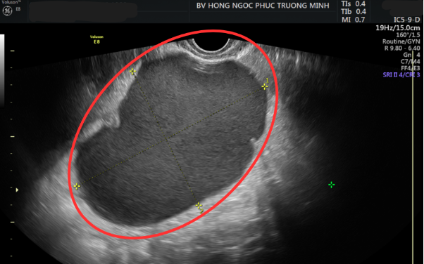 Sau khi thăm khám và siêu âm, bác sĩ phát hiện chị H có một khối u kích thước 10x13cm ở buồng trứng phải, nghi ngờ bên trong có nhiều máu đông, dấu hiệu điển hình của u nang socola, có nguy cơ ảnh hưởng tới sức khỏe và khả năng sinh sản.
