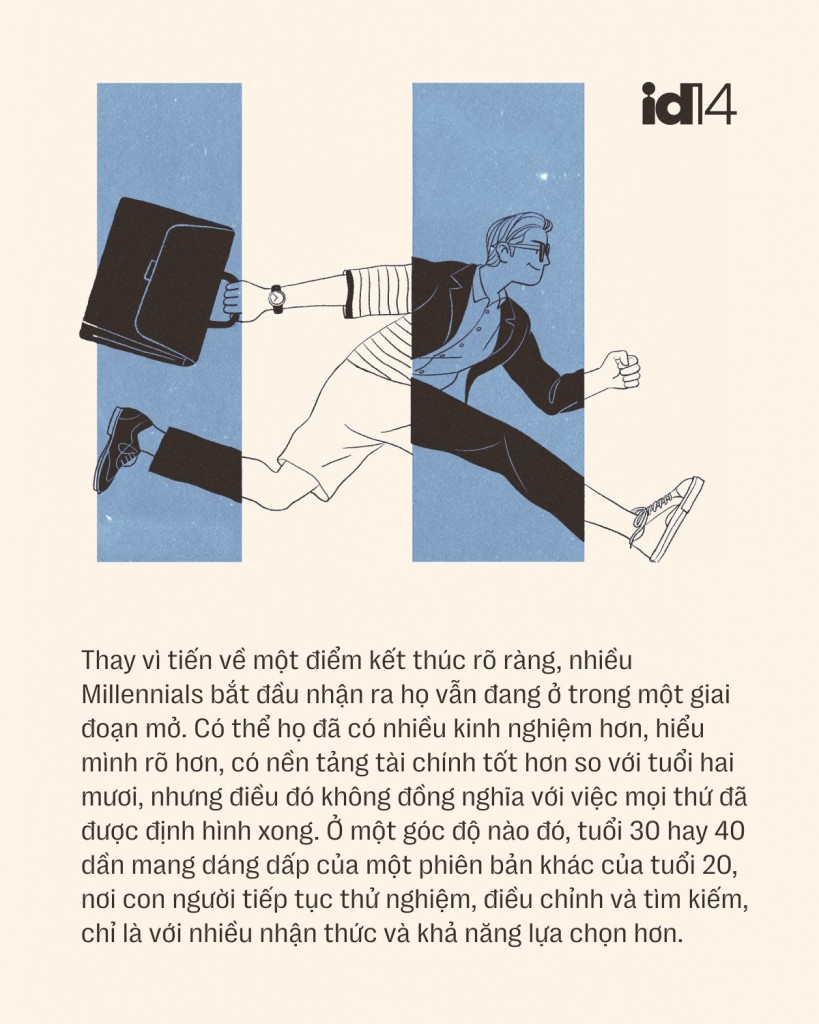 Thay vì tiến về một điểm kết thúc rõ ràng, nhiều Millennials bắt đầu nhận ra họ vẫn đang ở trong một giai đoạn mở. Có thể họ đã có nhiều kinh nghiệm hơn, hiểu mình rõ hơn, có nền tảng tài chính tốt hơn so với tuổi hai mươi, nhưng điều đó không đồng nghĩa với việc mọi thứ đã được định hình xong. Ở một góc độ nào đó, tuổi 30 hay 40 dần mang dáng dấp của một phiên bản khác của tuổi 20, nơi con người tiếp tục thử nghiệm, điều chỉnh và tìm kiếm, chỉ là với nhiều nhận thức và khả năng lựa chọn hơn.