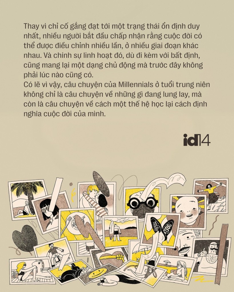 Có lẽ vì vậy, câu chuyện của Millennials ở tuổi trung niên không chỉ là câu chuyện về những gì đang lung lay, mà còn là câu chuyện về cách một thế hệ học lại cách định nghĩa cuộc đời của mình. Không còn một kịch bản chung, không còn một mốc đích cố định, nhưng đổi lại là một không gian rộng hơn để lựa chọn. Và trong không gian đó, việc chưa hoàn tất có thể không còn là điều cần phải khắc phục, mà trở thành một phần tự nhiên của hành trình đang tiếp diễn.