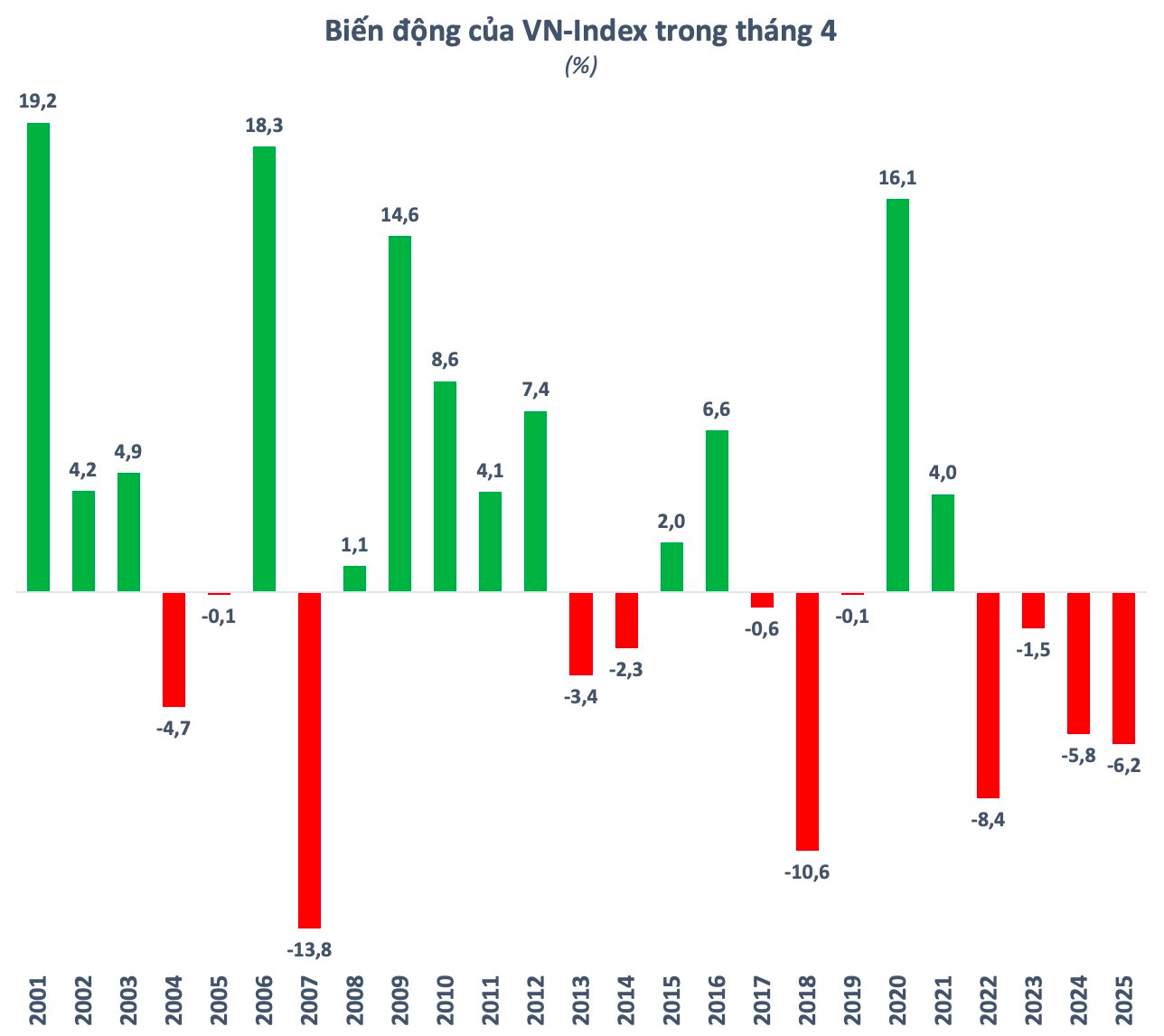 Năm ngoái, cú sốc thuế quan của Tổng thống Donald Trump ngay đầu tháng 4 khiến thị trường chứng khoán Việt Nam trải qua 1 trong những cú rơi khốc liệt nhất lịch sử. Xa hơn vào năm 2022, tháng 4 cũng là khởi đầu cho giai đoạn lao dốc của thị trường từ vùng đỉnh 1.500 điểm. Cùng năm đó, VN-Index có lúc đã xuống đến 900 điểm.