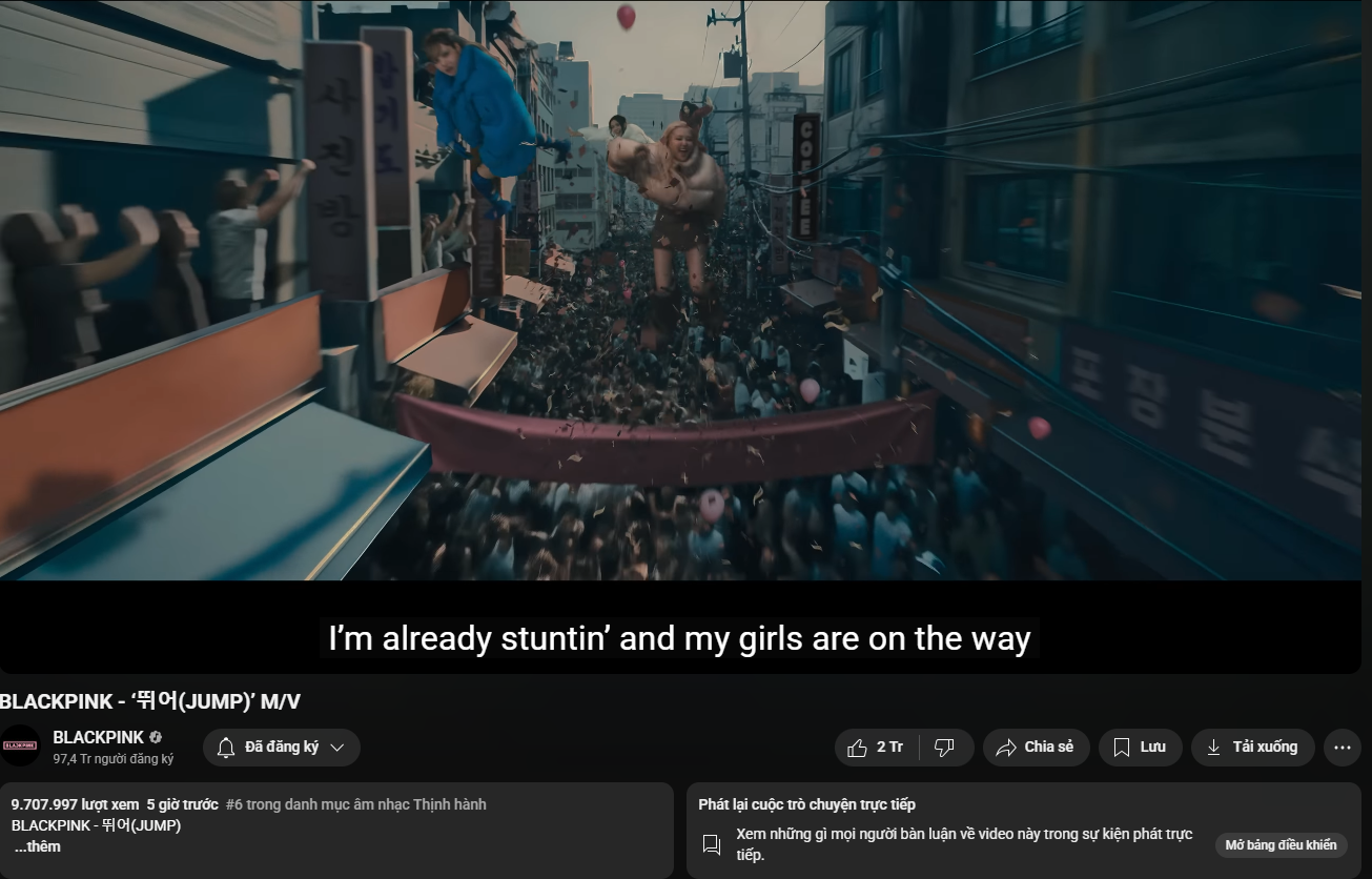 BLACKPINK cũng vừa comeback với MV JUMP trưa 11/7. Chưa đến nửa ngày, MV JUMP đã mang về gần 10 triệu view và on top #6 trending YouTube Việt Nam. Là nhóm nữ đứng đầu về thành tích YouTube, BLACKPINK có khả năng là chủ nhân của top 1 thịnh hành toàn cầu lần cuối cùng, trước khi tab trending bị “xóa sổ”.